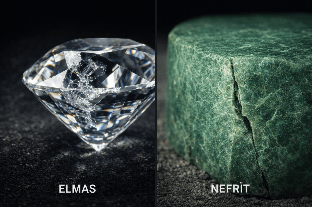 Tokluk işte bunu ölçer. Bir maddenin darbeyi emerek, enerjiyi dağıtarak, kırılmayı reddederek ayakta kalma yeteneği. Ve bu yarışta elmas sınıfta kalır. O parlak, o gösterişli, o “sonsuz” elmas, tokluğa gelince cam kadar kırılgandır. Yarışın tartışmasız şampiyonu ise o mütevazı görünümlü, kuyumcuların vitrininde ikinci sıraya koyduğu yeşimtaşıdır.