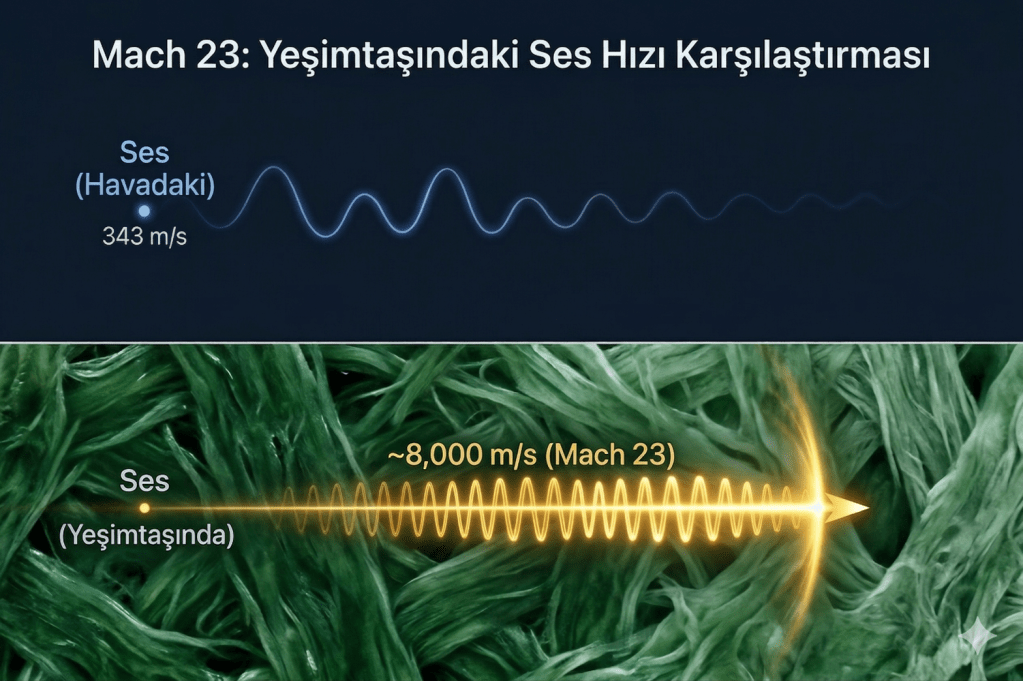 Ses, yeşimtaşının yoğun silikat yapısı içinde saniyede 8.000 metrenin üzerine çıkıyordu.