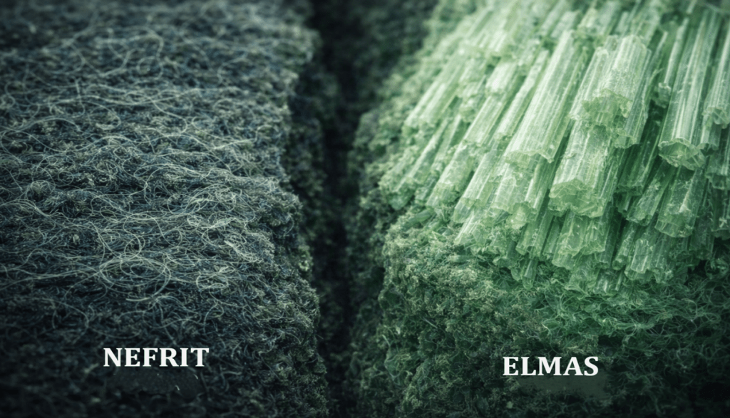 Nefrit böyle değildir. Nefrit, kelimesinin teknik anlamıyla bir kristal bile sayılmaz. O, milyonlarca mikroskobik lifin birbirine dolanarak, birbirinin içinden geçerek, düğümlenerek oluşturduğu kaotik ama yenilmez bir örgüdür.